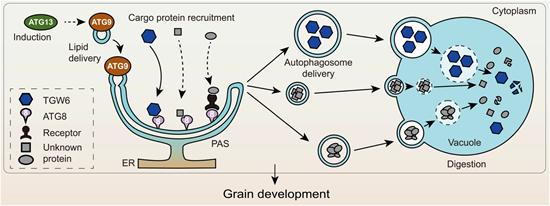 水稻细胞选择性自噬降解TGW6调节籽粒发育模式图