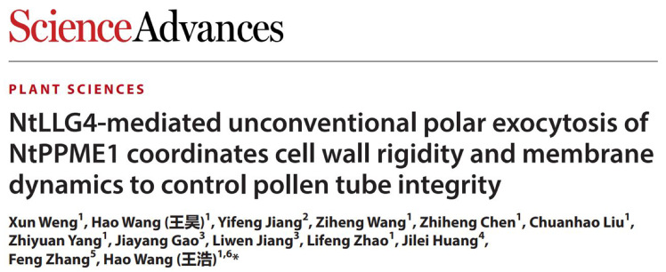 近日,华南农业大学生命科学学院王浩教授团队在Science杂志子刊Science Advances(影响因子近五年平均:14.1)上发表题为“NtLLG4-mediated unconventional polar exocytosis of NtPPME1 coordinates cell wall rigidity and membrane dynamics to control pollen tube integrity”的研究论文,该研究揭示了非典型极性胞吐途径的生物发生过程及其关联细胞壁与细胞膜来共同调控花粉管细胞生长和植物受精的分子作用机制。