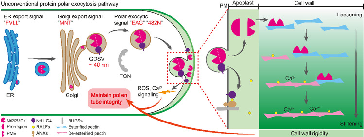 细胞壁和细胞膜在植物生长发育过程中如何互相沟通和协调一致?细胞膜需要扩张但细胞壁却坚如磐石可不行。以极性生长的花粉管为模型,该研究揭示了这一协调机制。被子植物生殖受精的核心是通过花粉管递送两个不可自主运动精细胞到胚囊。花粉管从柱头表面向雌配子体快速极性生长时,必须维持自身结构完整性,而在抵达胚囊后则需及时破裂以释放精细胞完成双受精。花粉管的生长调控和完整性维持取决于细胞膜与细胞壁的协同作用。王浩实验室前期研究发现了一条非典型极性胞吐途径。该途径可介导调控细胞壁刚性的关键果胶甲酯酶(Nicotiana tabacum pollen-specific pectin methylesterase 1,NtPPME1),通过高尔基体衍生囊泡(Golgi-derived secretory vesicles,GDSVs)绕过蛋白质经典胞吐外泌途径必经的反式高尔基网状体,直接极性分泌至质外体中,调控花粉管细胞壁刚性以维系细胞快速顶端生长。但是,该非典型极性胞吐途径的生物发生过程及其调控花粉管极性生长的分子作用机制尚未被揭示。此外,传统观点认为花粉管顶端聚集着形态相似、大小均一、直径约130纳米的典型微囊泡,其尺寸与GDSV存在显著差异。GDSVs是否可以被极性运输至花粉管顶端来介导蛋白质胞吐外泌也尚未明确。