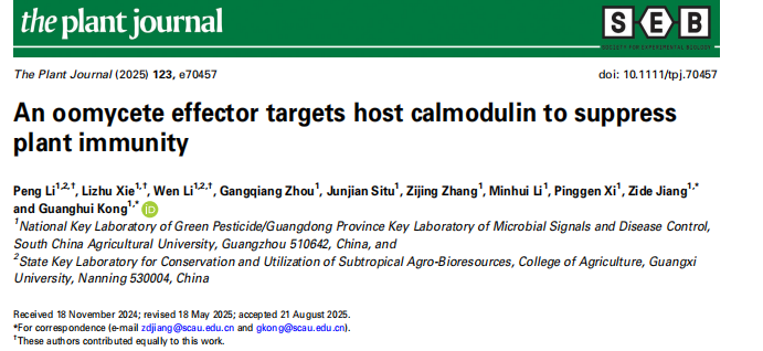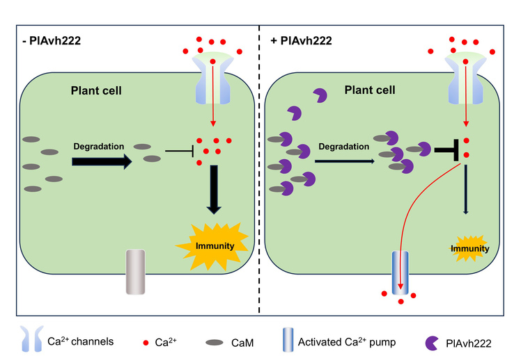 近日,华南农业大学植物保护学院荔枝病害研究团队在The Plant Journal发表了题为“An oomycete effector targets host calmodulin to suppress plant immunity”的研究论文。该研究发现了效应因子PlAvh222 通过与宿主钙调蛋白CaM互作,稳定其蛋白水平并抑制胞内钙离子积累,从而阻断钙信号介导的植物免疫反应,最终促进病原菌侵染。