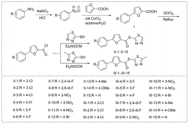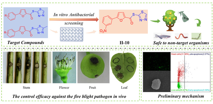 1,3,4-噻二唑的芳基呋喃硫酯类化合物合成及活性评价:本研究首次系统评估了含1,3,4-噻二唑的芳基呋喃硫酯类化合物对E. amylovora的体外抑菌活性。成功合成了30个目标化合物,并对其抑菌效能进行了系统性筛选。活性测试结果表明,化合物II-10对该病原菌表现出显著抑制作用,其半最大效应浓度其EC50为9.04µg/mL。