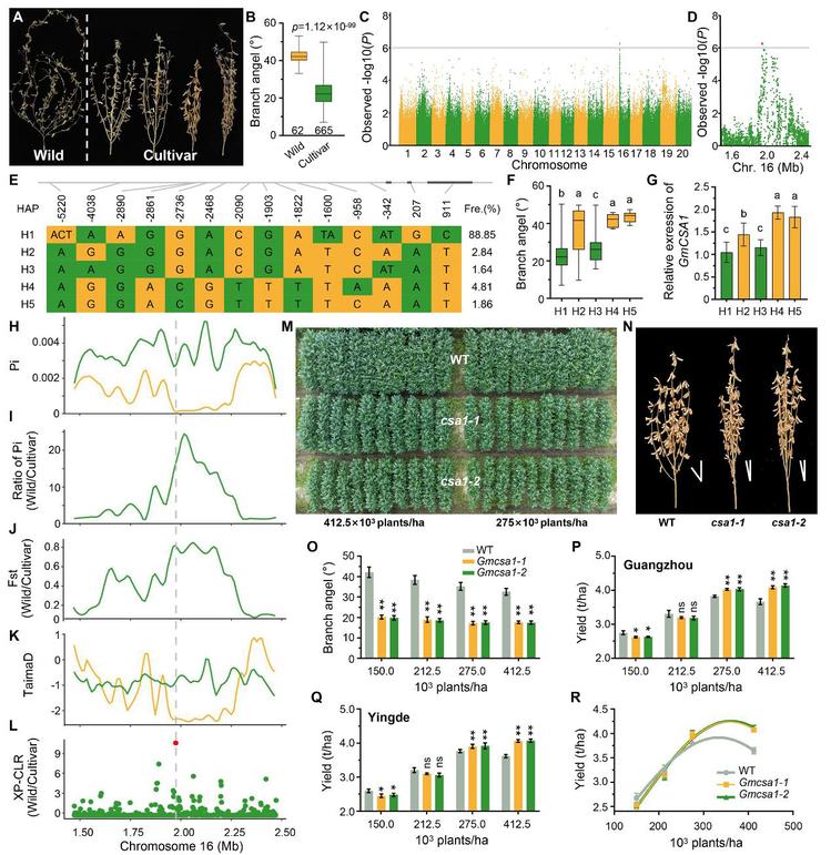 依托大规模大豆种质资源的分枝角度表型与基因型数据,本研究通过全基因组关联分析(GWAS),成功鉴定了控制大豆分枝角度和株型收敛性的关键基因 Compact Shoot Architecture 1(CSA1)。CSA1 是水稻分蘖角度关键基因Tiller Angle Control 1(TAC1)的同源基因,在大豆驯化过程中受到强烈选择,核苷酸多态性大幅度下降,群体分化指数Fst高达0.8。基因编辑验证显示,csa1编辑体的分枝角度明显减小,株型更为收敛。田间试验发现,在低密度下,csa1编辑体由于株型过于收敛,产量略低于野生型;但随着密度升高,野生型植株间竞争加剧,产量先升后降;而csa1编辑体因株型紧凑可充分利用空间,产量随密度上升持续提高,并超过野生型,表现出显著的耐密植和增产优势。不同大豆品种均存在适宜的种植密度,csa1突变可显著提升其密植适应性和产量潜力。该研究为创制耐密、高产大豆种质资源提供了新的基因靶点,具有重要的意义。