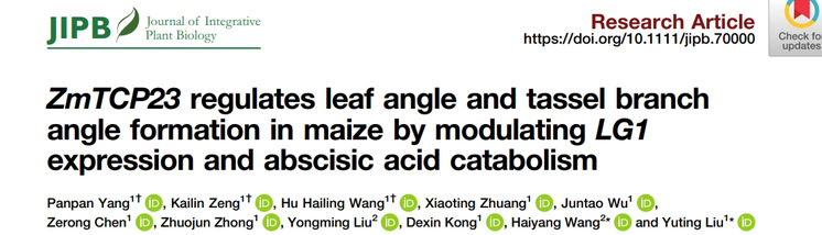 近日,我校生命科学学院、亚热带农业生物资源保护与利用国家重点实验室、广东省农业生物发育与环境适应重点实验室王海洋/刘宇婷团队联合崖州湾国家实验室在JIPB杂志发表了题为“ZmTCP23 regulates leaf angle and tassel branch angle formation in maize by modulating LG1 expression and ABA catabolism”的研究论文,揭示了转录因子ZmTCP23通过ZmTCP23-LG1-ZmXERICO1调控路径介导脱落酸(ABA)水平,进而影响玉米LA和TBA形成的分子机理。