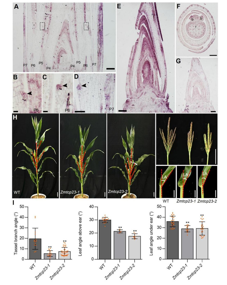 图1 ZmTCP23的表达模式及Zmtcp23突变体表型