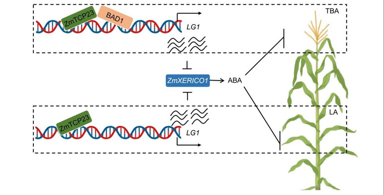 图2ZmTCP23-LG1-ZmXERICO1调控网络调控玉米LA和TBA的分子模型