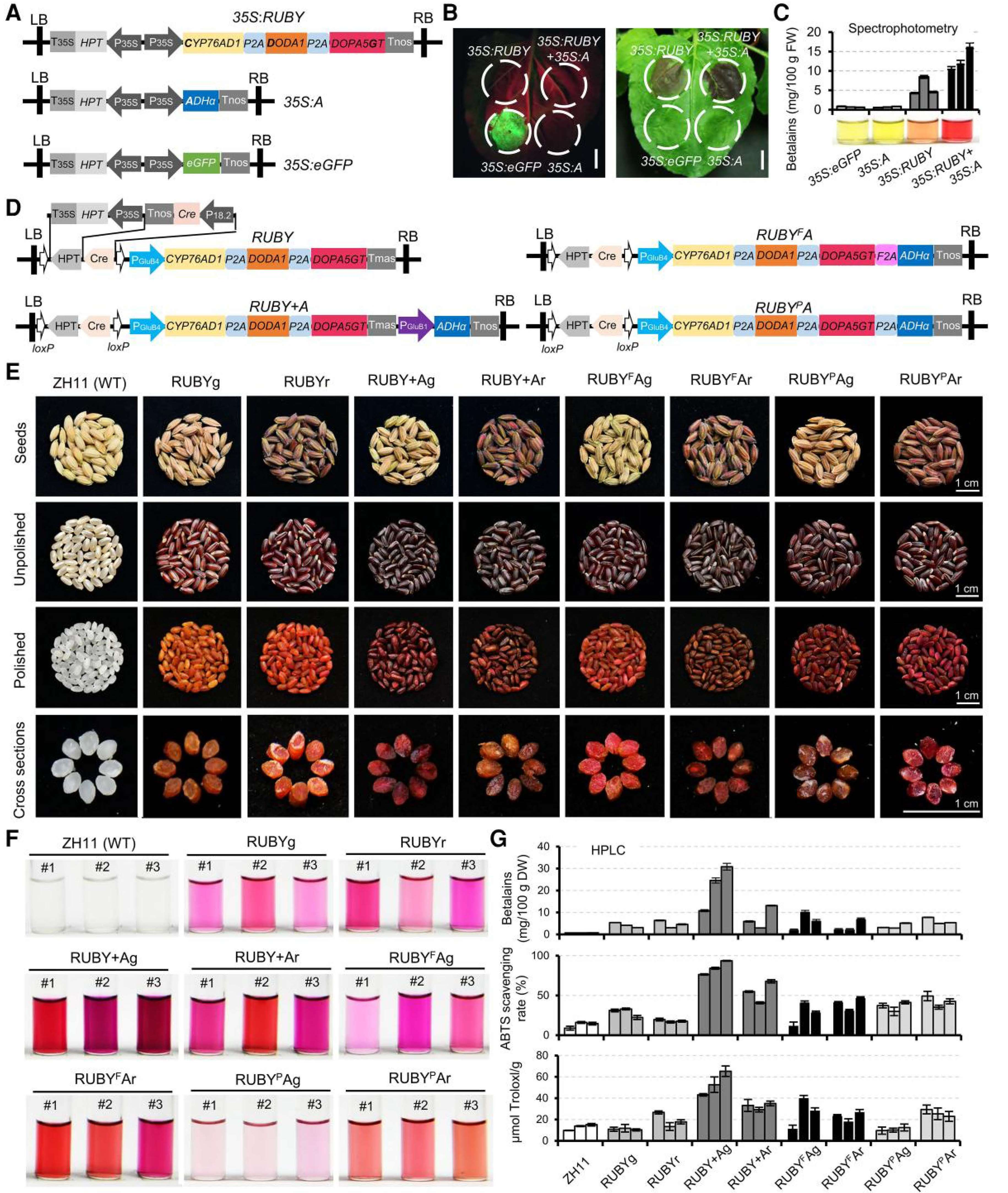 近日,农学院、广东省高等学校未来作物精准育种基础研究卓越中心、岭南现代农业科学与技术广东省实验室和亚热带农业生物资源保护与利用国家重点实验室刘耀光/祝钦泷/陈乐天团队与广东省农科院水稻所谭健韬副研究员在植物学著名期刊Plant Physiology在线发表了题为“eRUBY rice: Co-expression of a feedback-insensitive TyrA arogenate dehydrogenase with RUBY enhances endosperm betalain levels”的研究论文,利用“推—拉”的合成代谢工程策略开发出增强型的eRUBY(enhanced RUBY)报告系统,在烟草和水稻中验证其有效性和稳定性。通过多基因代谢工程技术培育出胚乳富含甜菜红素的水稻种质“红宝石米”(eRUBY rice),并评估了不同遗传元件组合在多顺反子基因表达中的效率,为基于RUBY系统的应用研究提供了新的强力元件工具,对推动作物绿色生物智造和提高粮食营养价值具有重要战略意义。