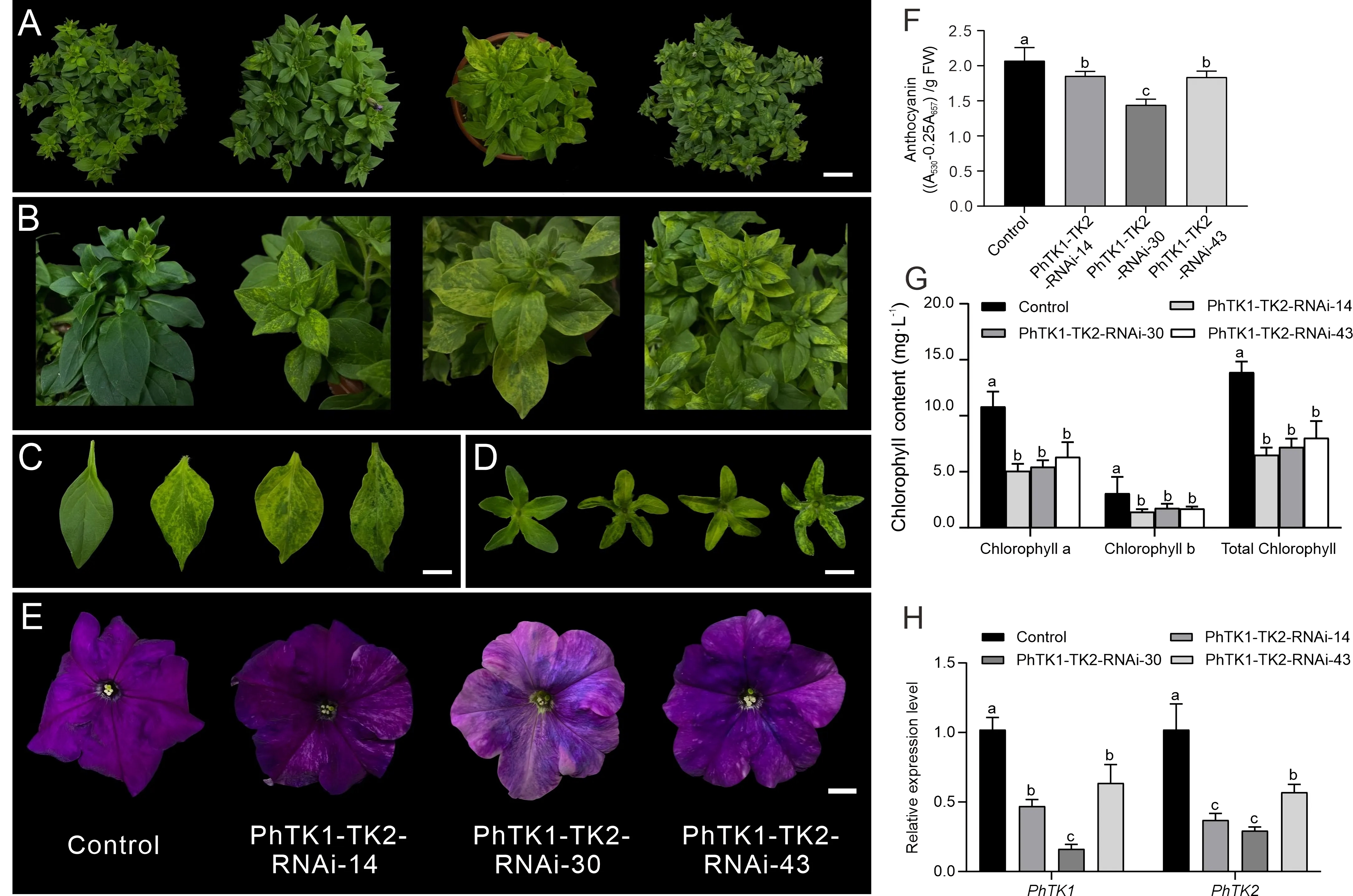 花青素合成依赖于上游的莽草酸途径。莽草酸途径需要两种关键前体物质:磷酸烯醇式丙酮酸(PEP)和赤藓糖-4-磷酸(E4P)。E4P在植物中主要由转醛醇酶(Transaldolase, TA)和转酮醇酶(Transketolase, TK)催化合成,然而花色形成过程中所必需的E4P的具体来源方式目前还尚不清晰。在第二篇论文中,该团队发现沉默矮牵牛PhTA的两个成员并未引起植株表型变化,而共同沉默PhTK1与PhTK2则导致花朵颜色显著变浅、叶片黄化。进一步分析表明,PhTK1与PhTK2共同沉默植株中E4P含量显著下降,伴随花青素、叶绿素、类黄酮及三种芳香族氨基酸(苯丙氨酸、酪氨酸、色氨酸)的含量均明显降低。代谢组学分析显示,共同沉默PhTK1与PhTK2扰乱了花瓣中类黄酮代谢物的组成。该结果显示花色形成过程中E4P来源于TK催化的果糖-6-磷酸。结合团队前期研究发现PhENO1和PhPPT共同为花色形成提供了关键的PEP来源(https://doi.org/10.1093/hr/uhaf040)。该团队揭示了花色形成过程中莽草酸途径的两种关键前体物质PEP和E4P的来源方式,为观赏植物花色改良和花色素代谢工程提供了重要理论依据。