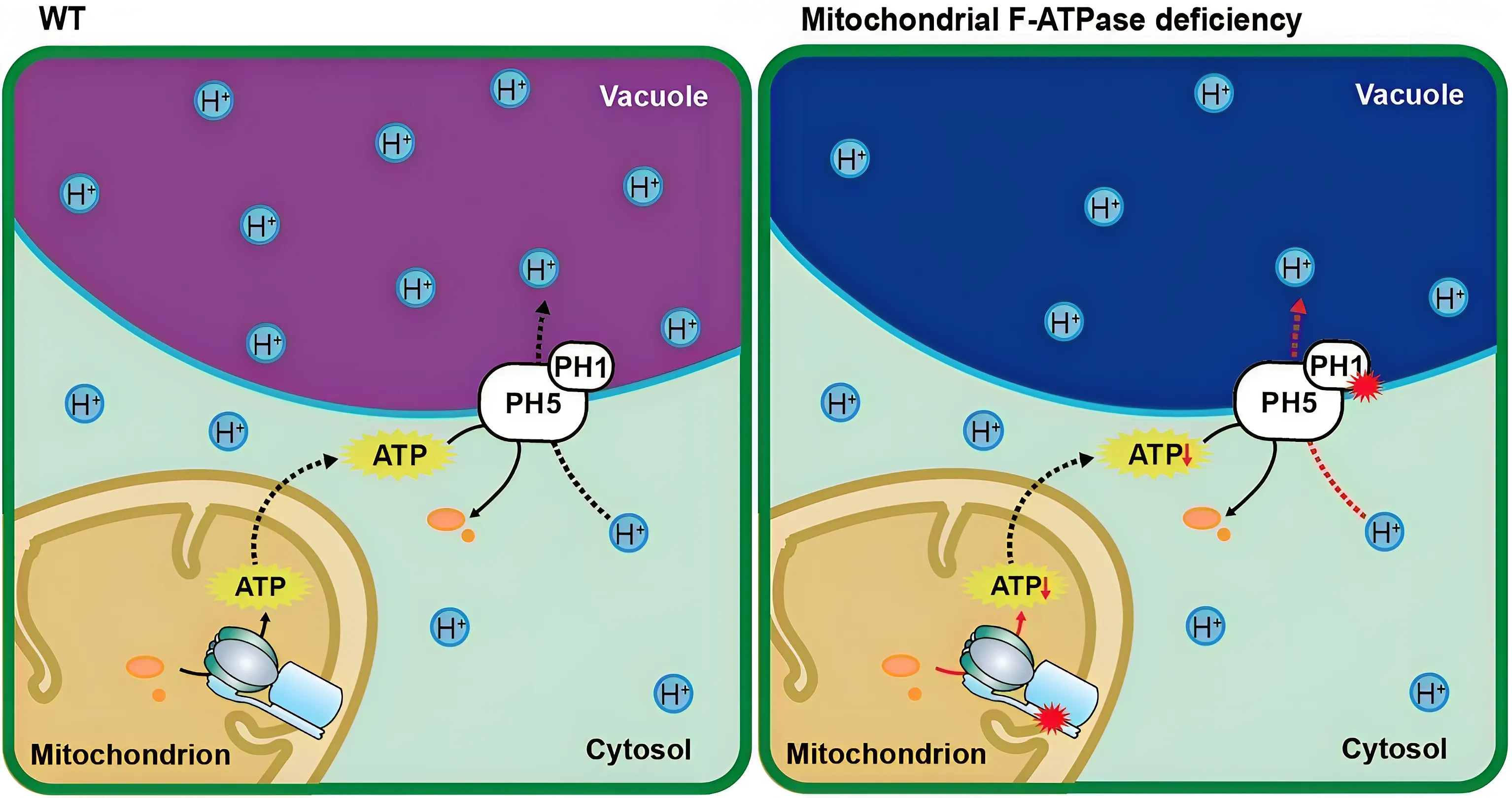 花色是观赏植物的重要性状,植物细胞液泡pH决定花色苷吸收光谱并影响花色。人们已经知道,细胞液泡膜上的质子泵蛋白 P-ATP酶和 V-ATP酶像“水泵”一样,能把H+泵进液泡,使其保持酸性,如矮牵牛中的PhPH1和PhPH5,它们失活会导致液泡碱化,花色变深变蓝。除了这些已知的质子泵蛋白,是否还有其他蛋白质也参与调节液泡的酸碱度呢?在第一篇论文中,该团队利用基因沉默技术,从矮牵牛基因组中156个功能未知基因中筛出了一个基因PhDC(DEEPENING COLOR),该基因沉默的花瓣颜色明显变深。PhDC定位于线粒体中,进一步研究表明PhDC是线粒体F-ATP酶的一个新亚基。PhDC沉默导致的颜色变深的花瓣,其花青素的总量和种类并没有明显变化,而其液泡pH值显著升高了,这是花色变深的直接原因。PhDC缺失导致F-ATP酶复合体合成ATP效率下降。负责给液泡泵入氢离子、维持酸性的 P-ATP酶(如PhPH1和PhPH5)活性降低,因为给这个“水泵”供能的正是ATP。