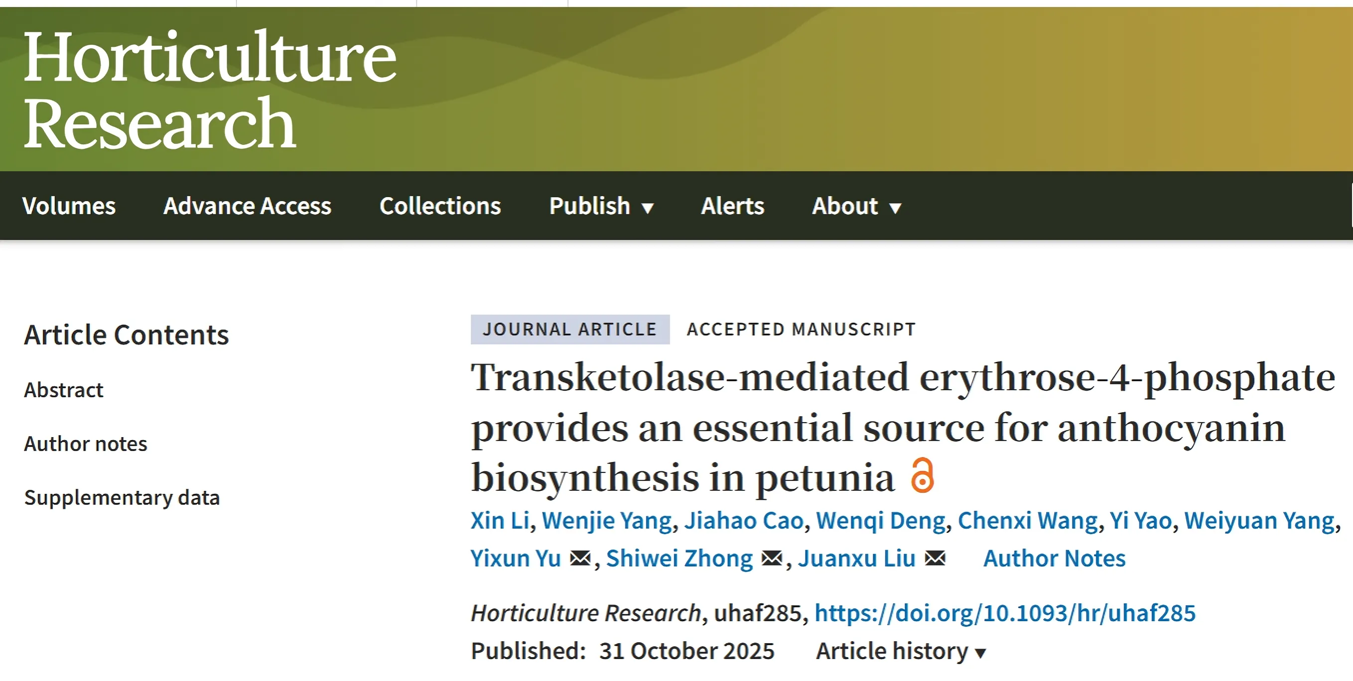 近日,园艺学院花卉研究团队取得一系列研究成果,在期刊New Phytologist在线发表题为“A new small subunit of the mitochondrial F-ATPase, PhDC, determines flower color by acidifying vacuoles”的研究论文,在期刊Horticulture Research在线发表题为“Transketolase-mediated erythrose-4-phosphate provides an essential source for anthocyanin biosynthesis in petunia”的研究论文。