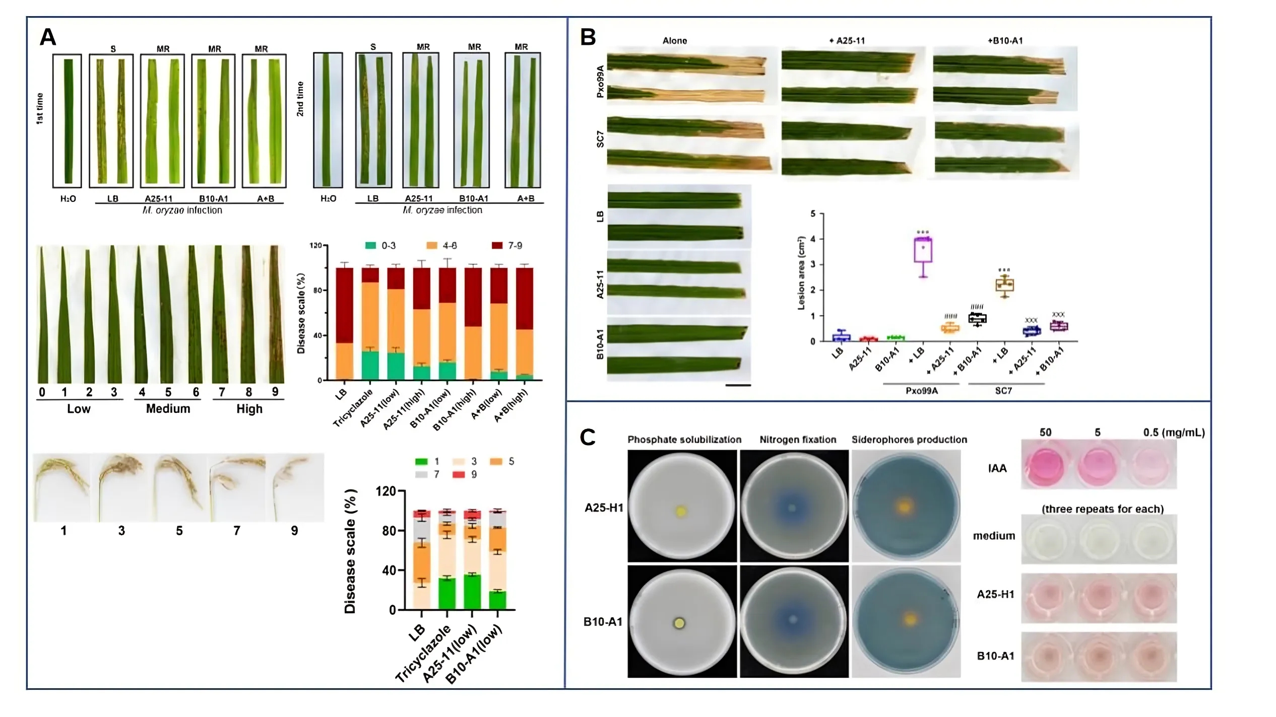 该研究基于16S rRNA扩增子测序分析发现,在稻瘟病易感水稻品种CO39的茎部组织中,泛菌属(Pantoea spp.)菌群的丰度显著增加。研究人员从中分离并鉴定出3株菠萝泛菌P. ananatis菌株(A25-F1,A25-G1和A25-H1,合成菌群为A25-11)和1株分散泛菌P. dispersa菌株(B10-A1)。室内盆栽接种试验或田间试验结果均表明A25-11与B10-A1菌株可有效抑制水稻稻瘟病的发生(图1A)。而两种菌株对水稻植株本身均未表现出致病性。除此之外,菠萝泛菌菌株也能有效抑制由黄单胞菌Pxo99A菌株或另一致病菠萝泛菌SC7菌株引起的水稻细菌性叶枯病(图1B)。这两种菌株具有促进生长的多重能力,包括诱导吲哚-3-乙酸(IAA)合成、促进磷酸盐溶解、增强固氮能力以及分泌铁载体(图1C)。