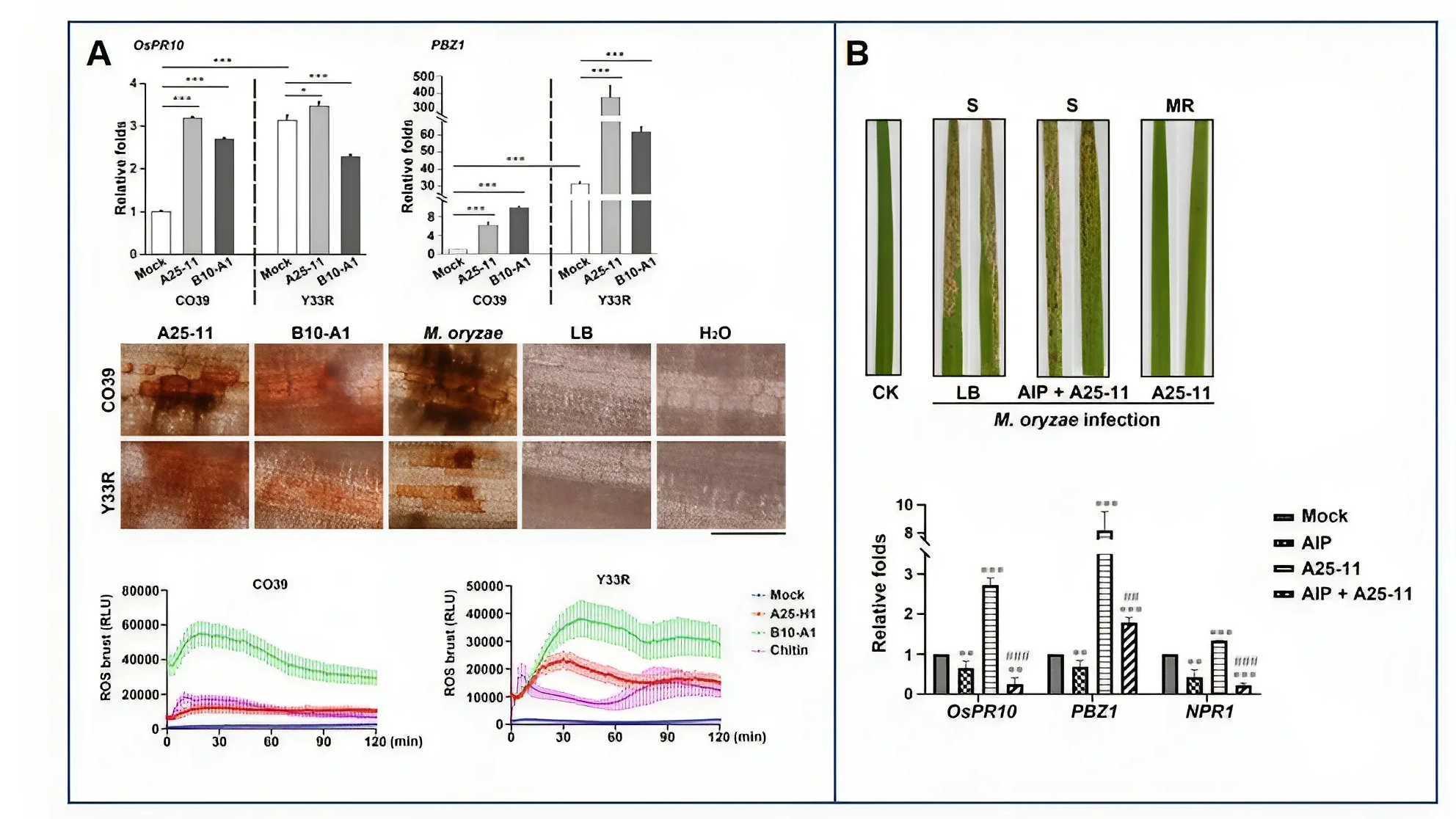 进一步研究发现,A25-11或B10-A1菌株处理能显著诱导水稻叶片中免疫相关基因的表达并促进活性氧(ROS)积累,表明其生防效应可能源于对寄主植物免疫系统的激活(图2A)。而施用植物PAL酶抑制剂(可抑制水杨酸合成)AIP预处理水稻,则使A25-11或B10-A1菌株的生防效果大打折扣(图2B),提示生防泛菌可能通过激活植物水杨酸信号介导的系统获得性抗性赋予水稻抗病能力。