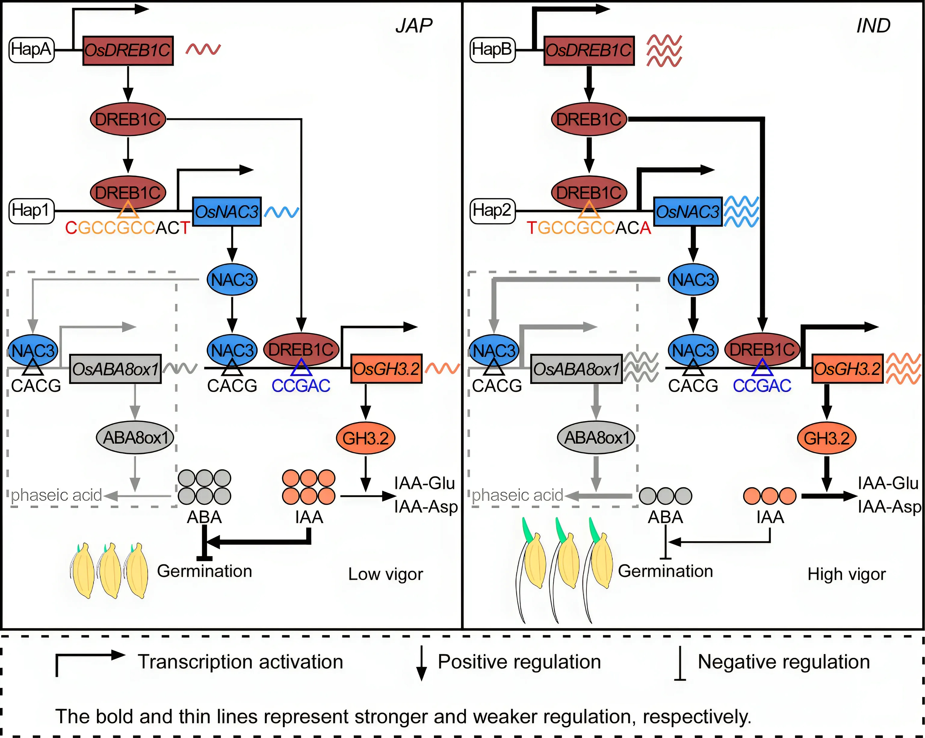 本研究鉴定了一个由OsDREB1C、OsNAC3和OsGH3.2组成的转录级联通路,通过ABA介导的IAA途径调控种子萌发(图1)。研究发现,与野生型相比,在ABA存在条件下,施加IAA可显著抑制Osnac3突变体种子萌发。分子机制研究表明,OsNAC3可直接结合IAA代谢基因OsGH3.2启动子,在萌发早期激活其表达,从而降低种子中IAA积累。同时,OsNAC3启动子序列的自然变异会影响转录因子OsDREB1C与其结合的亲和力,而OsDREB1C能同时激活OsNAC3和OsGH3.2表达。在遗传关系上,OsNAC3位于OsDREB1C下游发挥功能,同时OsNAC3作为上游调控因子作用于OsGH3.2,形成转录级联调控,通过ABA依赖的IAA途径调控种子萌发。