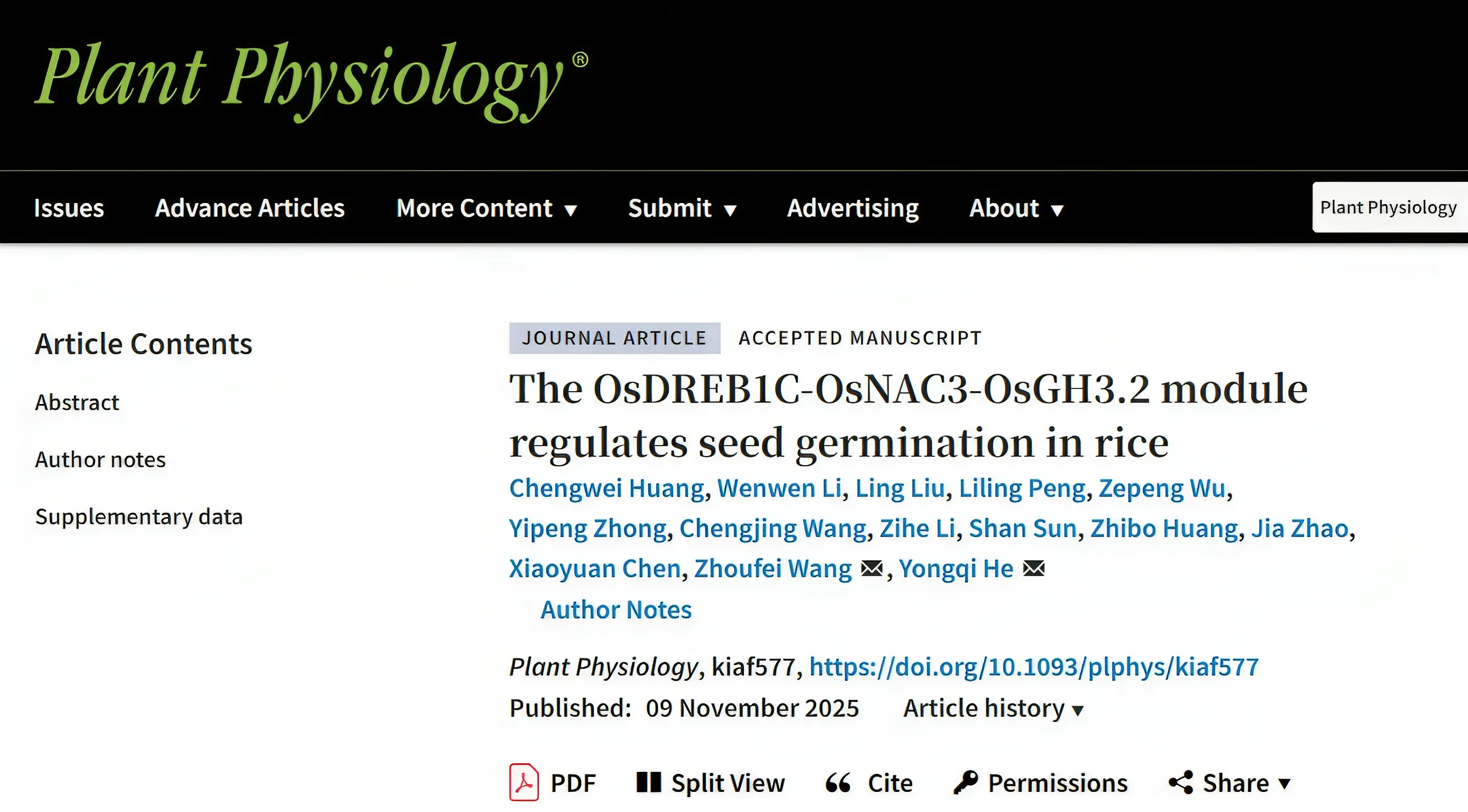 近日,农学院、广东省高等学校未来作物精准育种基础研究卓越中心王州飞教授团队在国际知名学术期刊Plant Physiology在线发表了题为“The OsDREB1C-OsNAC3-OsGH3.2 module regulates seed germination in rice”的研究论文,揭示了OsDREB1C-OsNAC3-OsGH3.2通过脱落酸(ABA)介导的生长素(IAA)途径调控水稻种子萌发的新通路,并明确了其在育种中的利用价值。