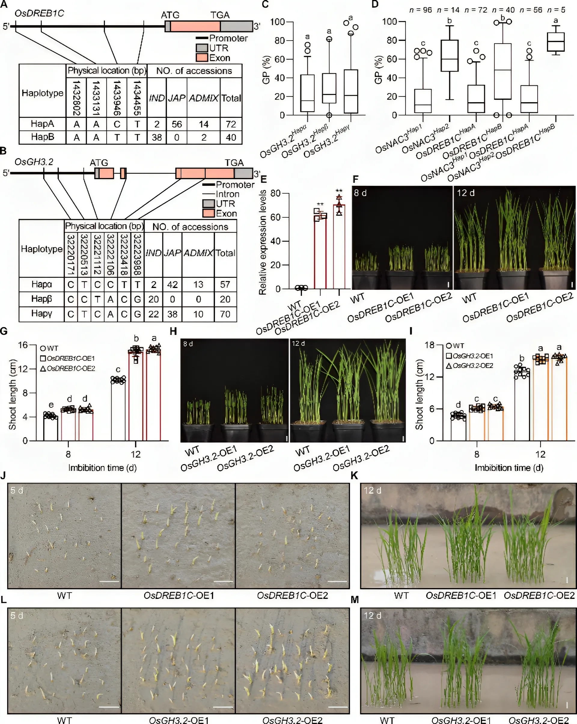 在基因育种利用方面,本研究开展了OsDREB1C和OsGH3.2基因优异单倍型分析(图2)。结果显示,携带OsDREB1CHapB单倍型的种质发芽率显著高于OsDREB1CHapA型,而OsGH3.2的3种单倍型均与种子萌发无显著关联。结合前期鉴定的控制种子萌发的OsNAC3Hap2优异单倍型(Huang et al. 2024),进一步评估发现,聚合优异单倍型OsNAC3Hap2和OsDREB1CHapB能显著提高种子发芽率。OsNAC3Hap2和OsDREB1CHapB主要存在于籼稻中,在粳稻中几乎缺失。但是,在粳稻品种中过表达OsDREB1C或OsGH3.2,可以显著促进种子萌发。可见,OsDREB1C-OsNAC3-OsGH3.2模块是一个潜在的遗传改良靶点,可以通过分子标记辅助选择或基因过表达等策略,培育适宜直播轻简栽培的水稻新品种,并提高作物产量。