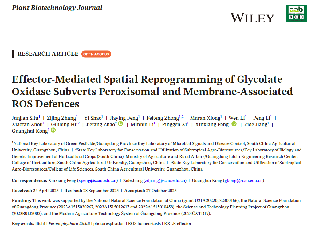 近日,植物保护学院荔枝病害研究团队在植物学知名期刊Plant Biotechnology Journal(中科院一区TOP期刊,IF5year=12.4)发表了题为“Effector-mediated spatial reprogramming of glycolate oxidase subverts peroxisomal and membrane-associated ROS defenses”的研究论文。该研究揭示了植物病原卵菌抑制植物免疫新机制:荔枝霜疫霉RXLR效应子PlAvh133通过将荔枝乙醇酸氧化酶从过氧化物酶体挟持至细胞质膜,同时干扰光呼吸和RBOHD两大活性氧释放途径,从而抑制活性氧迸发,促进病原菌侵染。