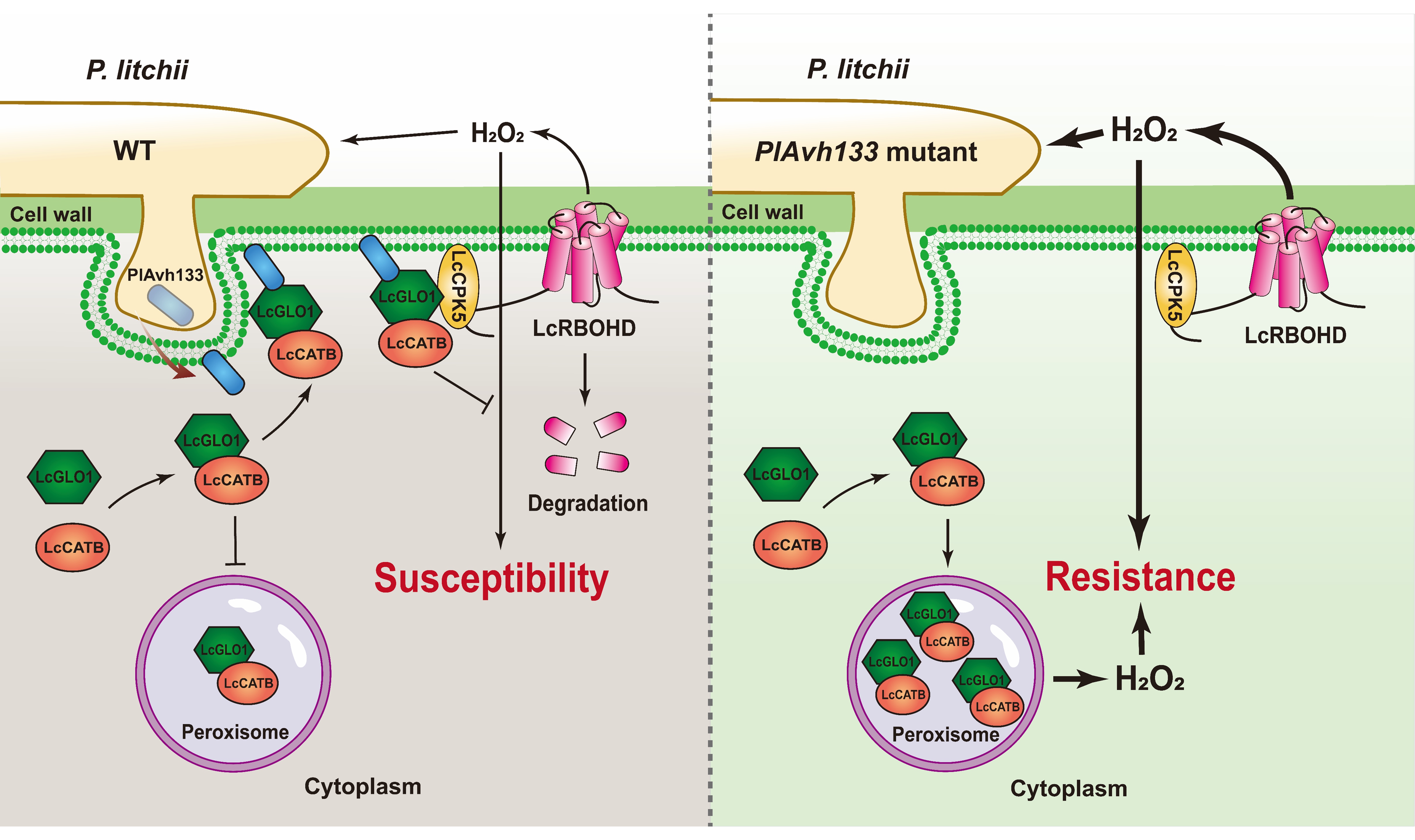 乙醇酸氧化酶可以将乙醇酸转化为乙醛酸,释放H202,而质膜定位的LcGLO1却抑制植物的活性氧迸发,从而增加植物感病性。进一步研究证明,效应子PlAvh133可直接抑制LcGLO1的酶活并使LcGLO1-LcCAT定位至质膜从而提高H202分解效率。
