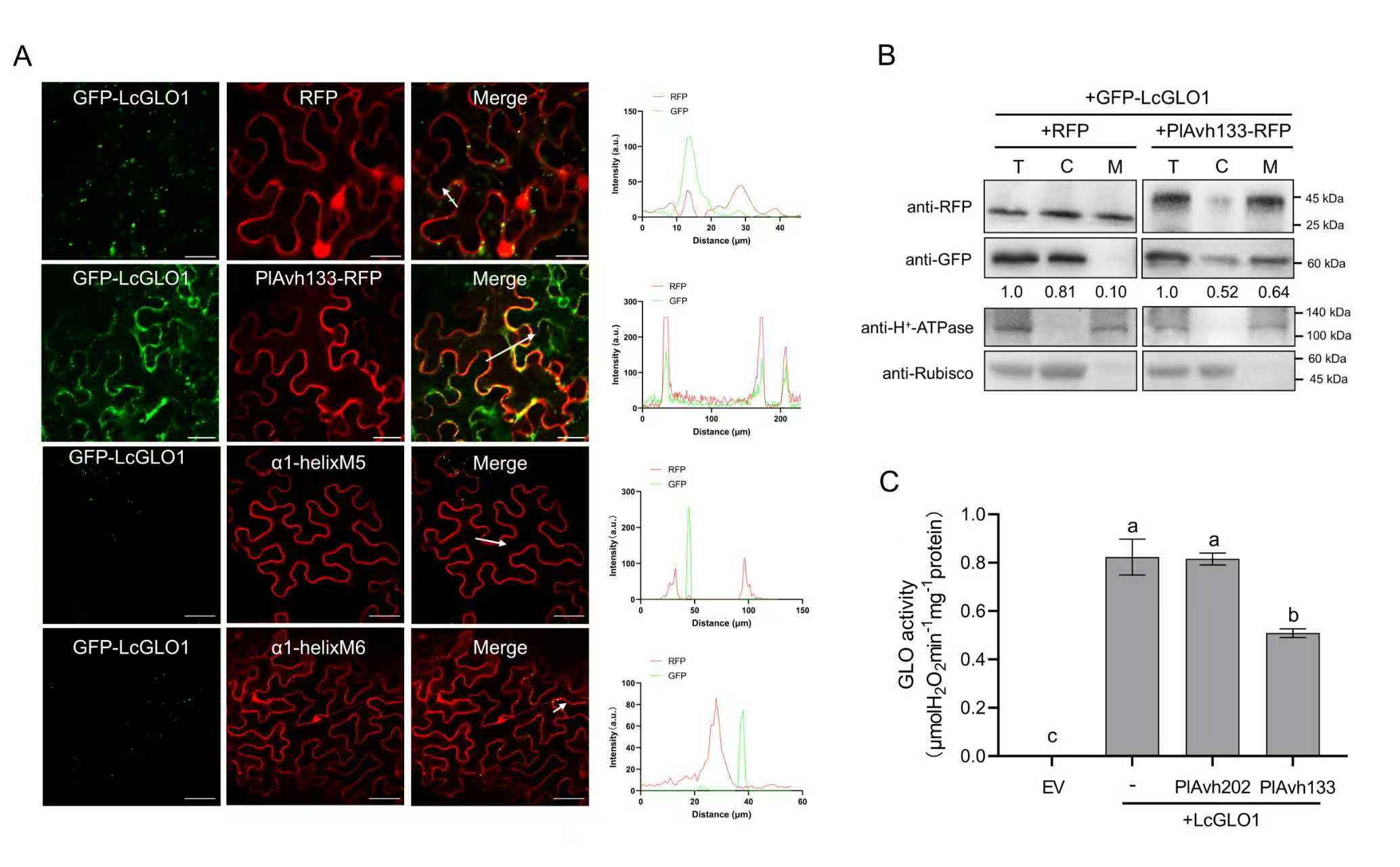 该研究通过免疫共沉淀联合质谱,筛选鉴定到了PlAvh133的植物靶标蛋白为乙醇酸氧化酶LcGLO1,随后的体内体外实验均证明它们之间存在强互作;使用共聚焦显微镜分别观察二者的亚细胞定位,PlAvh133定位在植物细胞的细胞质膜上,而LcGLO1定位在过氧化物酶体当中;当同时表达PlAvh133和LcGLO1时,LcGLO1会显著地定位到细胞质膜上。