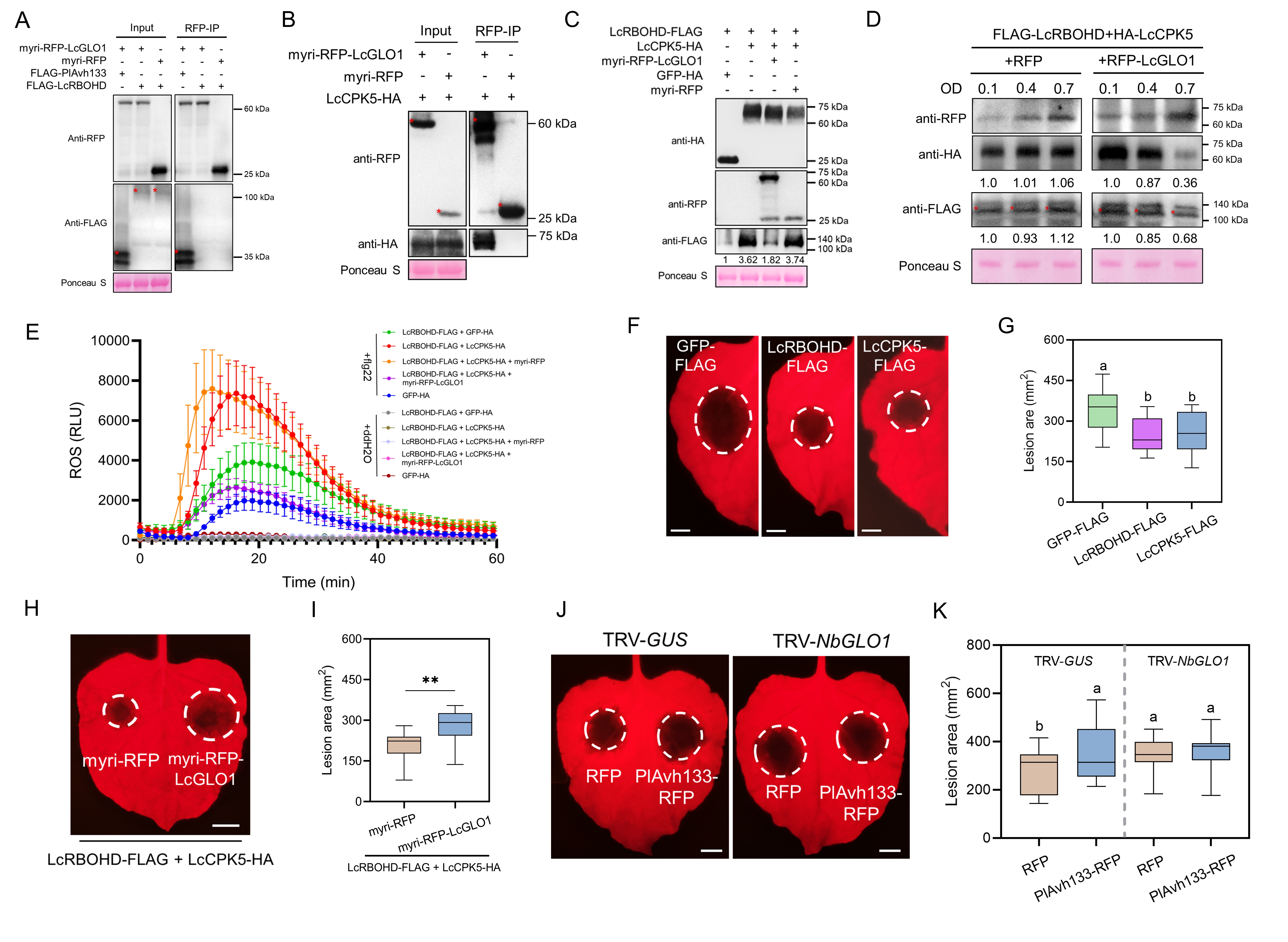 该研究还发现质膜定位的LcGLO1能够与LcCPK5互作,该蛋白是一个能磷酸化RBOHD的钙依赖性蛋白激酶,能将病原菌侵染胁迫诱发的瞬时钙信号迅速转化为磷酸化事件,进而调控ROS迸发;两蛋白互作后可以抑制LcRBOHD的蛋白积累量,降低ROS迸发。