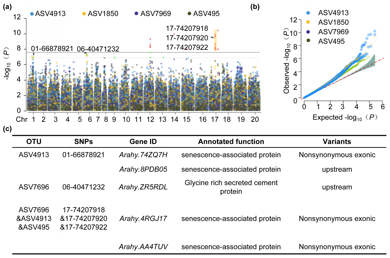图2 与花生单株结瘤数显著正相关的OTUs的全基因组关联分析