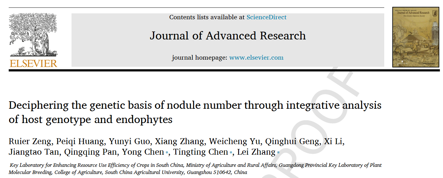 近日,华南农业大学农学院、农业农村部华南作物资源高效利用重点实验室、广东省植物分子育种重点实验室张雷副研究员团队在国际知名学术期刊Journal of Advanced Research(中科院一区Top,影响因子13.0)在线发表了题为“Deciphering the genetic basis of nodule number through integrative analysis of host genotype and endophytes”的研究论文,首次结合宿主基因型和内生菌两个层面综合解析了花生根瘤数量的遗传基础,研究成果为“优化结瘤固氮促进高产优质”的花生精准智能育种提供重要的基因资源和基因编辑靶点。
