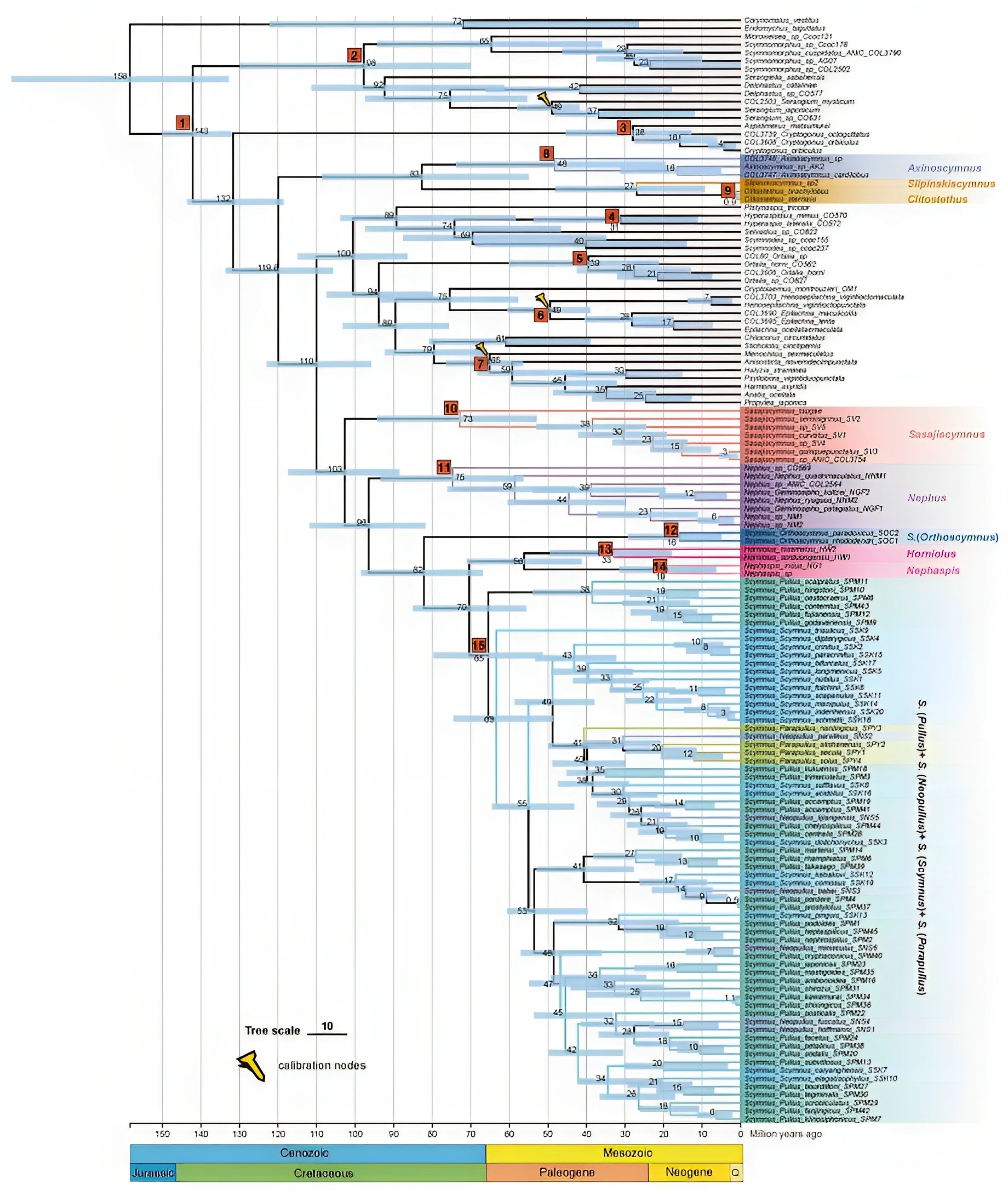 本研究基于3个线粒体和5个核基因分子标记(总长4,935 bp),对亚洲小毛瓢虫族的系统发育关系与演化历史进行了研究。研究结果证实了亚洲小毛瓢虫族的非单系性,其中斧瓢虫属Axinoscymnus、陡胸瓢虫属Clitostethus和奇叶毛瓢虫属Slipinskiscymnus形成一个独立的分支,与小毛瓢虫族的主要类群相分离。研究结果高度支持了弯叶毛瓢虫属Nephus、方突毛瓢虫属Sasajiscymnus、云瓢虫属Nephaspis和角毛瓢虫属Horniolus的单系性。同时,小毛瓢虫属Scymnus的单系性未得到证实,原因在于两个直小毛瓢虫亚属Scymnus(Orthoscymnus)的样品聚为一支,并与小毛瓢虫属的其他类群分离;小毛瓢虫属内部亚属之间的系统发育关系较为混乱,需进行进一步的分类学修订。分歧时间的估算结果显示,亚洲小毛瓢虫族的物种多样化发生在古新世至中新世之间,同时瓢虫的起源时间可追溯至白垩纪早期的1.43亿年前(143 Mya)。总体而言,该研究是目前针对小毛瓢虫族取样最为广泛的系统发育研究工作,其结果对于小毛瓢虫族的分类修订以及对其演化历史的理解具有重要意义,同时也将推动亚洲乃至世界范围内瓢虫系统分类学工作的发展。