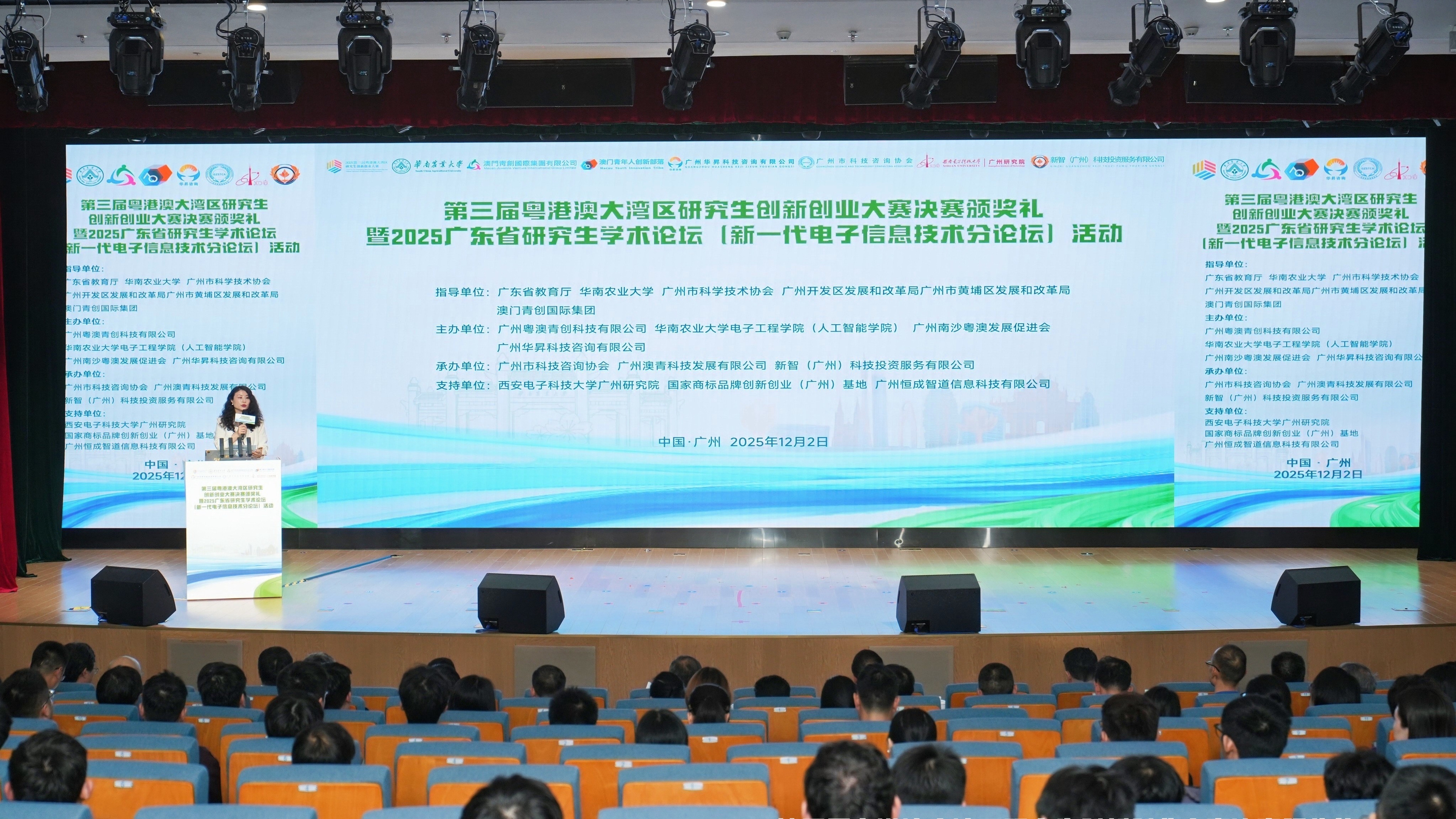 12月2日,2025广东省研究生学术论坛(新一代电子信息技术分论坛)活动在广州举办。本次论坛由广东省教育厅、华南农业大学、广州市科学技术协会、广州开发区发展和改革局、广州市黄埔区发展和改革局、澳门青创国际集团共同指导,由华南农业大学电子工程学院(人工智能学院)、广州南沙粤澳发展促进会等单位联合主办。活动以“才聚湾区,创领未来”为主题,共吸引来自政府部门、高校院所、行业企业的嘉宾以及粤港澳三地的优秀研究生近300人参会。