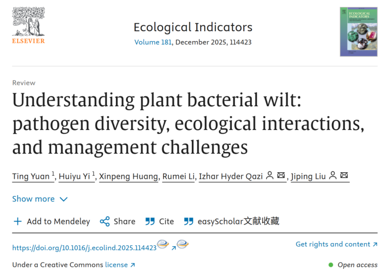 近日,动物科学学院刘吉平教授课题组在Ecological Indicators 发表了题为“Understanding plant bacterial wilt: pathogen diversity, ecological interactions, and management challenges”的综述论文。
