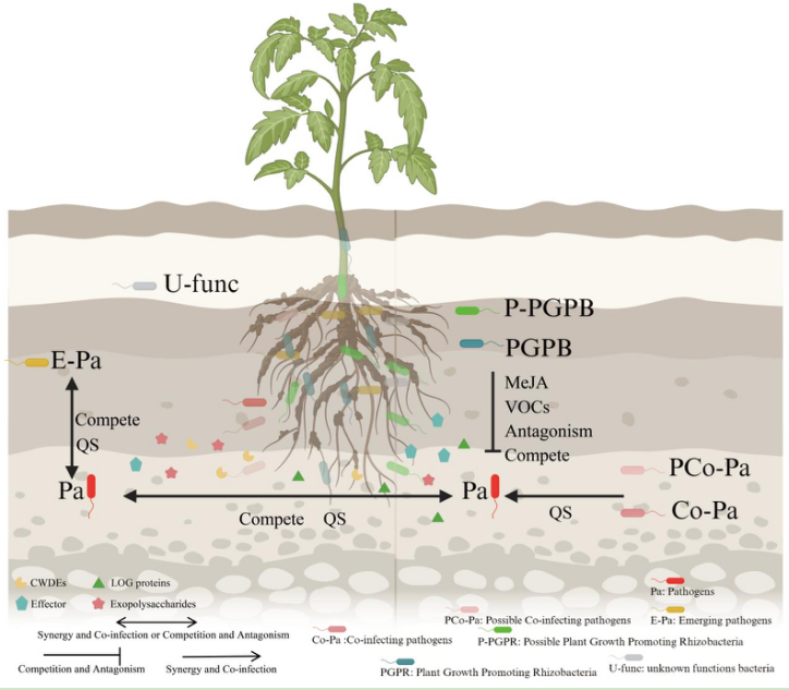 图1:微生物相互作用及其对植物细菌性枯萎病病原体-宿主动态的影响