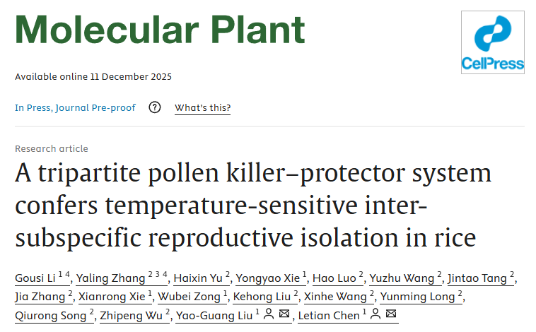 12月11日,农学院未来作物精准育种基础研究卓越中心的陈乐天/刘耀光团队在国际著名刊物Molecular Plant(影响因子24.1)在线发表了题为“A tripartite pollen killer–protector system confers temperature-sensitive inter-subspecific reproductive isolation in rice”的研究论文。该研究揭示了水稻Sa座位三基因“杀手‒保镖”系统的分子遗传基础,首次阐明植物杂种不育响应环境温度的全新分子机理,为诠释水稻亚种形成和地理扩张过程中生殖隔离系统的演化机制和环境适应性提供新视角。
