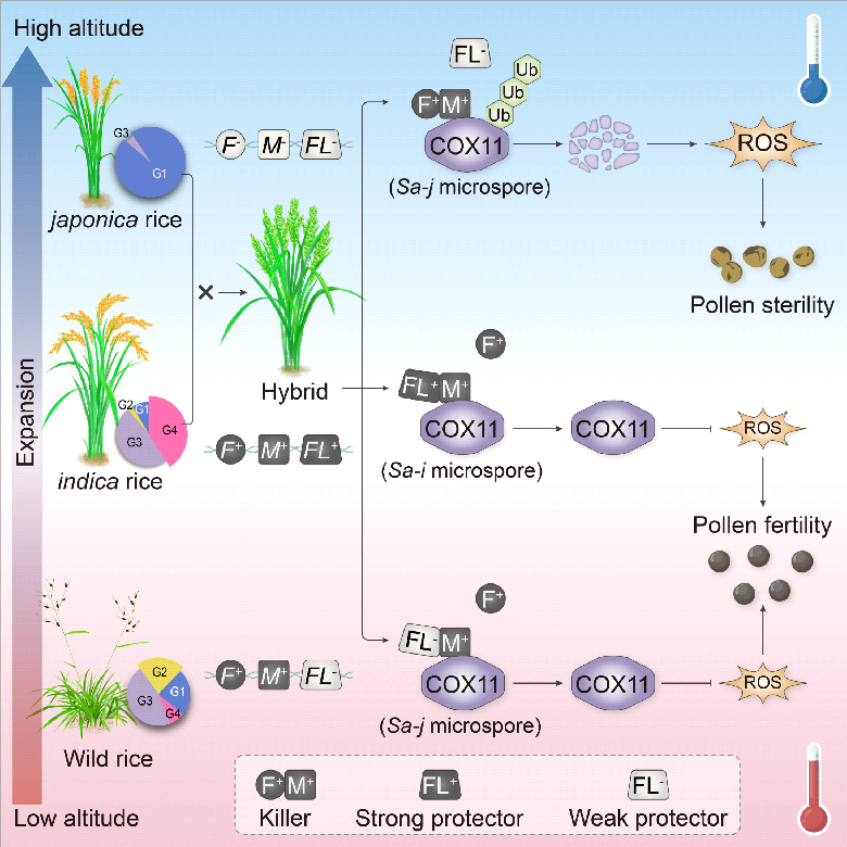 水稻籼粳杂种雄性不育复合座位Sa中,SaF、SaM和SaFL组成一个温度敏感的花粉“杀手‒保镖”系统,其中籼稻的SaF+和SaM+形成复合体作为“杀手”,靶向线粒体活性氧清除蛋白COX11,促进后者泛素化降解,导致活性氧过量积累从而引起花粉不育。籼稻中的SaFL+是一个强功能的“保镖”,而粳稻中的SaFL-只在高温下起作用,是一个弱功能“保镖”。在籼粳杂种中,一半的花粉携带籼稻强功能SaFL+,它能竞争性优先结合SaM+从而破坏杀手复合体,保护花粉正常发育;另一半的花粉携带弱功能SaFL-,其在高温下才发挥功能,使花粉呈现低温不育,高温可育的特性。