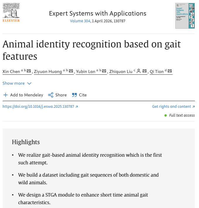 近日,人工智能与低空技术学院陈欣副教授在人工智能知名期刊Expert Systems with Applications(ESWA,中科院一区)发表题为“Animal identity recognition based on gait features”的研究论文。其中,陈欣副教授为文章第一作者,学校兰玉彬教授、暨南大学刘志全教授、华为云田奇教授为文章合作作者。
