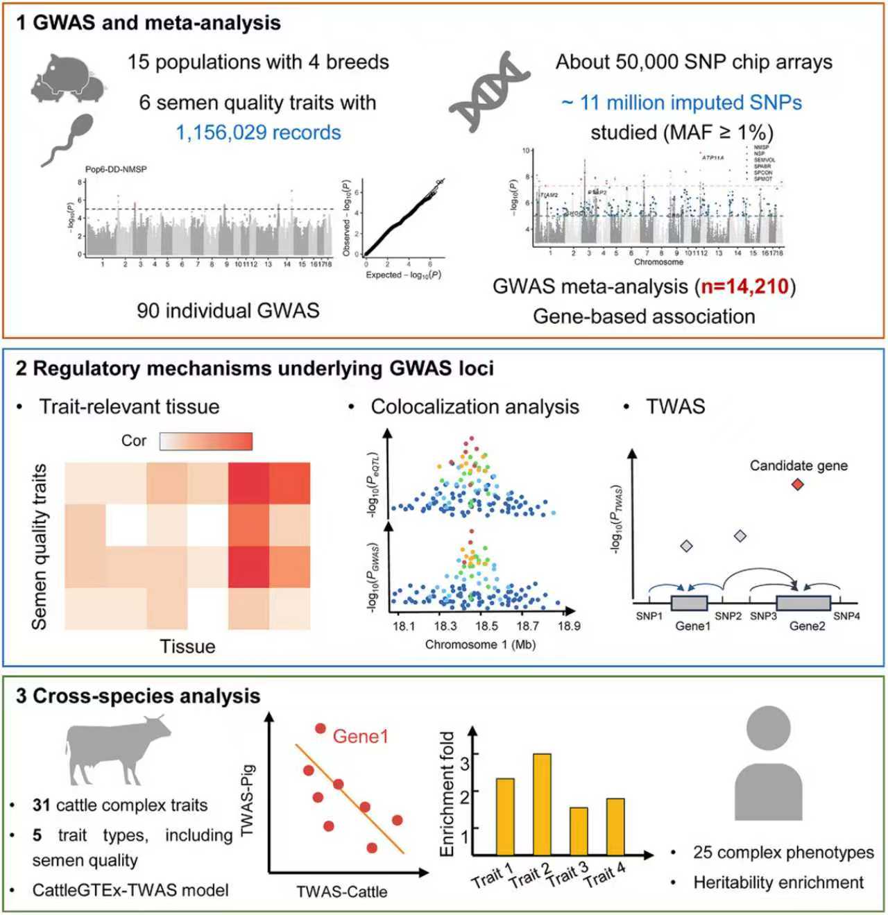 公猪作为繁育体系的核心遗传资源,具有举足轻重的地位。精液品质是评估公猪种用价值和遗传效率的关键指标之一,深入开展精液品质性状遗传解析,有助于加快公猪精液品质性状分子选育速率。尽管前期已有研究对精液品质性状进行了初步解析,但其背后的遗传调控机制尚不明晰。该研究收集了四个品种的14,210头公猪、115万条的6个精液品质性状记录,开展全基因组关联分析(GWAS)和多品种荟萃分析,共检测到234个与精液品种相关的GWAS信号,解析了公猪精液品质性状的遗传结构。随后,通过整合PigGTEx等多组学功能基因组数据,最终筛选出93个靶向134个基因的潜在候选基因。例如,NAXE基因通过介导多类组织调控精子数量性状,而LEFTY2基因仅在睾丸组织发挥作用调控精液体积性状。此外,全转录组关联分析发现了TTC29、DMRTA1等关键候选基因。综上,系统解析了调控公猪精液品质性状的潜在遗传调控路径。最后,结合奶牛重要经济性状、人类复杂性状等数据开展富集分析,发现了调控猪与奶牛精液品质性状的潜在同源基因(如AURKAIP1和ADRA2A基因),并且发现了公猪精液品质性状关联信号显著富集于人类生长相关性状。本研究为哺乳动物精液品质性状的遗传解析提供了新见解,可为公猪精液品质性状的选育提供关键遗传位点和重要候选基因,并为人类男性不育症的研究提供潜在靶点。
