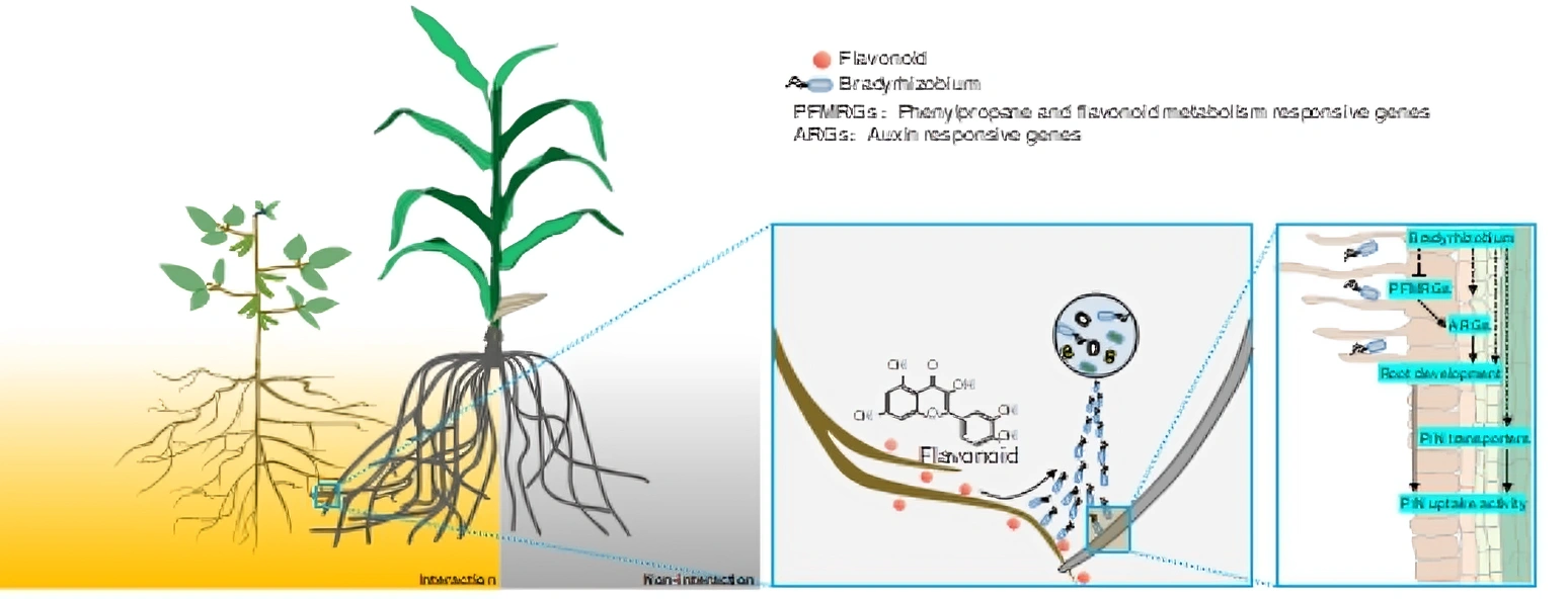 研究团队通过盆栽间作试验、根际微生物群落分析、慢生根瘤菌分离与接种实验以及转录组分析发现,大豆根系分泌类黄酮在大豆/玉米间作体系中作为关键信号分子,能够显著招募传统上被认为专一共生于豆科植物的慢生根瘤菌(Bradyrhizobium)进入玉米根际,并在两种作物根系交互区发生特异性富集。慢生根瘤菌通过调控玉米根系类黄酮代谢通路,并协同激活多种养分转运相关基因表达,最终促进玉米根系和磷效率提升。该研究从分子调控和微生物生态学层面系统阐明了慢生根瘤菌在非共生宿主玉米中的促生新功能,揭示了根系分泌物驱动有益微生物跨物种作用的新机制,为通过调控根际微生物提升间作体系养分利用效率和推动农业可持续发展提供了重要理论依据。