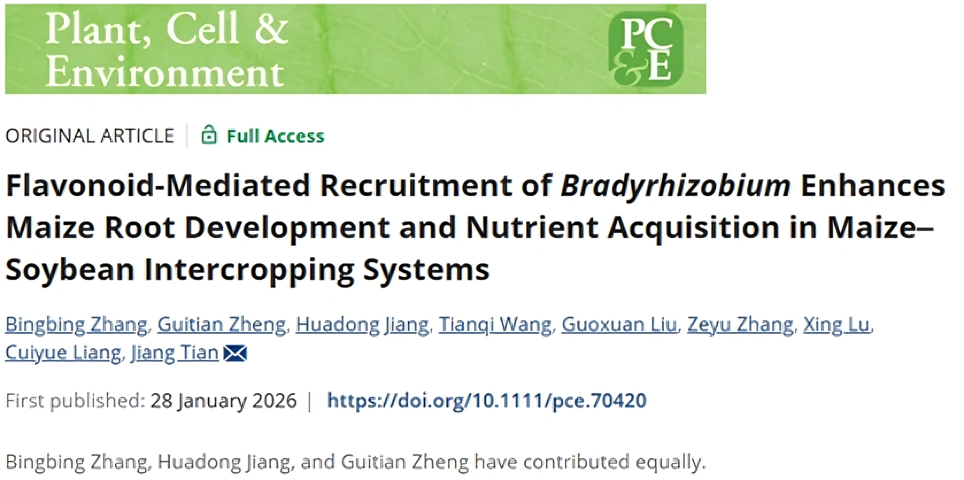 近日,资源环境学院根系生物学研究中心田江研究员课题组在Plant, Cell & Environment(中科院一区Top期刊)发表研究论文“Flavonoid-mediated recruitment of Bradyrhizobium enhances maize root development and nutrient acquisition in maize–soybean intercropping systems”,系统揭示类黄酮介导慢生根瘤菌跨物种招募并促进玉米根系生长与养分吸收的新机制。