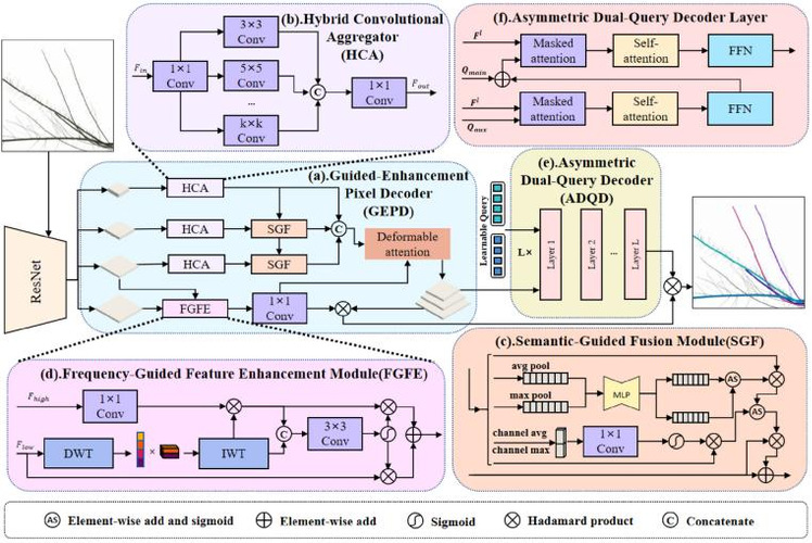 根系长度、数量等表型性状是植物生长和生产力的关键指标,但由于根系形态细长、密集重叠且频繁遮挡,精准提取这些性状面临挑战。传统数字图像处理方法通量低、鲁棒性有限,多数深度学习方法依赖语义分割,无法区分单个根系,限制了实例级表型分析的应用。为解决这一问题,团队提出专为根系表型分析设计的新型实例分割模型DGA-MP-Former。该模型基于MP-Former框架,创新引入引导增强像素解码器(GEPD)和非对称双查询解码器(ADQD)两大核心模块:GEPD通过混合卷积聚合器、语义引导融合模块和频率引导特征增强模块提升多尺度特征表示,有效捕捉精细根系结构和低对比度区域;ADQD借助语义查询与实例查询的非对称交互,优化长距离依赖建模和遮挡场景下的实例分离。同时,团队构建了水稻根系分割数据集(RRSD),包含343张带实例级标注的高分辨率图像。