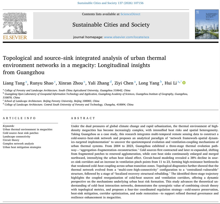 近日,林学与风景园林学院李晖教授团队在国际期刊《Sustainable Cities and Society》(中科院一区TOP期刊,影响因子12.0)发表题为“Topological and source–sink integrated analysis of urban thermal environment networks in a megacity: Longitudinal insights from Guangzhou”的研究论文。