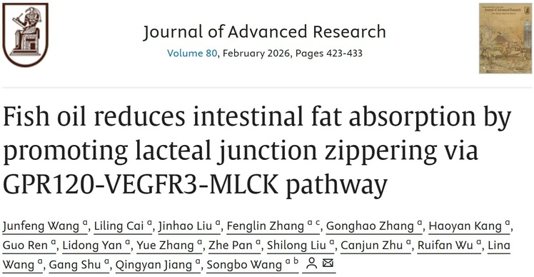 近日,我校动物科学学院江青艳教授和王松波教授团队,以猪禽种业全国重点实验室/岭南现代农业科学与技术广东省实验室/广东省动物营养调控重点实验室为第一单位,在国际主流学术期刊Journal of Advanced Research(中科院一区top期刊,影响因子13.0)发表了题为“Fish oil reduces intestinal fat absorption by promoting lacteal junction zippering via GPR120-VEGFR3-MLCK pathway”的研究论文,研究首次揭示鱼油通过GPR120-VEGFR3-MLCK通路促进肠道的乳糜管连接"拉链化",从而减少肠道脂肪吸收。