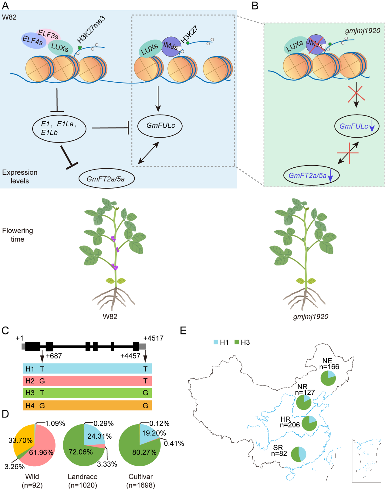 自然变异单倍型分析表明,GmLUX2-GmJMJ19/20这条新通路,很可能正是大豆适应不同日照长度的关键“微调旋钮”之一。GmJMJ19的H1和H3单倍型在农家种和改良品种中的占比显著高于野生大豆,表明其在驯化与改良过程中可能受到选择。其中,表达水平相对较低的H1单倍型,其开花时间晚于表达水平较高的H3单倍型。尤为重要的是,在我国大豆产区,随着纬度降低,适应短日照、开花较晚的H1单倍型占比呈现逐步升高的趋势(图2)。这一发现不仅直观体现了该基因在自然变异与人工选择下的“微调”作用,更从地理分布上印证了其生态适应性,为面向不同纬度地区的分子设计育种提供了可操作的遗传靶点。