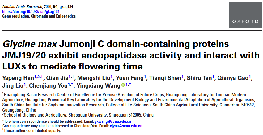 近日,生命科学学院王应祥课题组在国际期刊Nucleic Acids Research(2025年影响因子13.1)在线发表题为“Glycine max Jumonji C domain-containing proteins JMJ19/20 exhibit endopeptidase activity and interact with LUXs to mediate flowering time”的研究论文。该研究首次在植物中揭示了两个编码组蛋白去甲基化酶GmJMJ19和GmJMJ20并不具有去甲基化活性,而是在组蛋白未修饰的 H3K27 位点发挥水解切割的功能,并通过与生物钟夜晚复合体成员GmLUX2 相互作用,促进下游基因GmFULc的表达,进而调控大豆的开花时间。