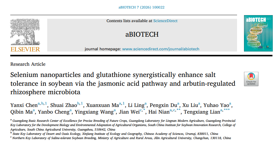 土壤盐渍化严重制约大豆产量与品质,纳米材料在增强作物抗逆性方面具有应用潜力,但其与根际微生物组的互作机制尚不明确。课题组开发了壳聚糖稳定的硒纳米颗粒与谷胱甘肽的纳米复合材料(SeG),发现其通过激活茉莉酸信号通路、促进根系分泌关键代谢物熊果苷,进而招募耐盐促生菌群,实现纳米材料驱动的植物-代谢物-微生物协同抗盐。SeG处理在大豆田间试验中表现出稳定的增产效果,并在番茄和玉米中展现了跨物种的耐盐调控效应,为开发靶向植物-微生物互作的新型纳米抗逆材料提供了参考。相关成果发表于aBIOTECH(影响因子5.1)。农学院2023级硕士生陈彦希、2023级硕士生马宣宣和中国科学院新疆生态与地理研究所赵帅副研究员为共同第一作者,连腾祥副教授、年海教授和吉林农业大学魏健教授为共同通讯作者。