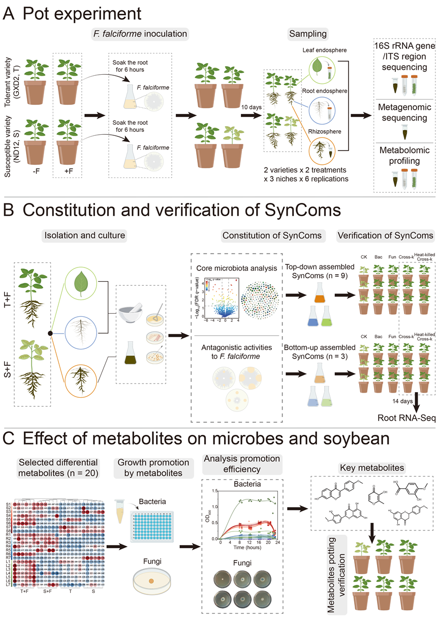 1.揭示跨生态位代谢物-微生物组互作协同防控大豆根腐病机制。
