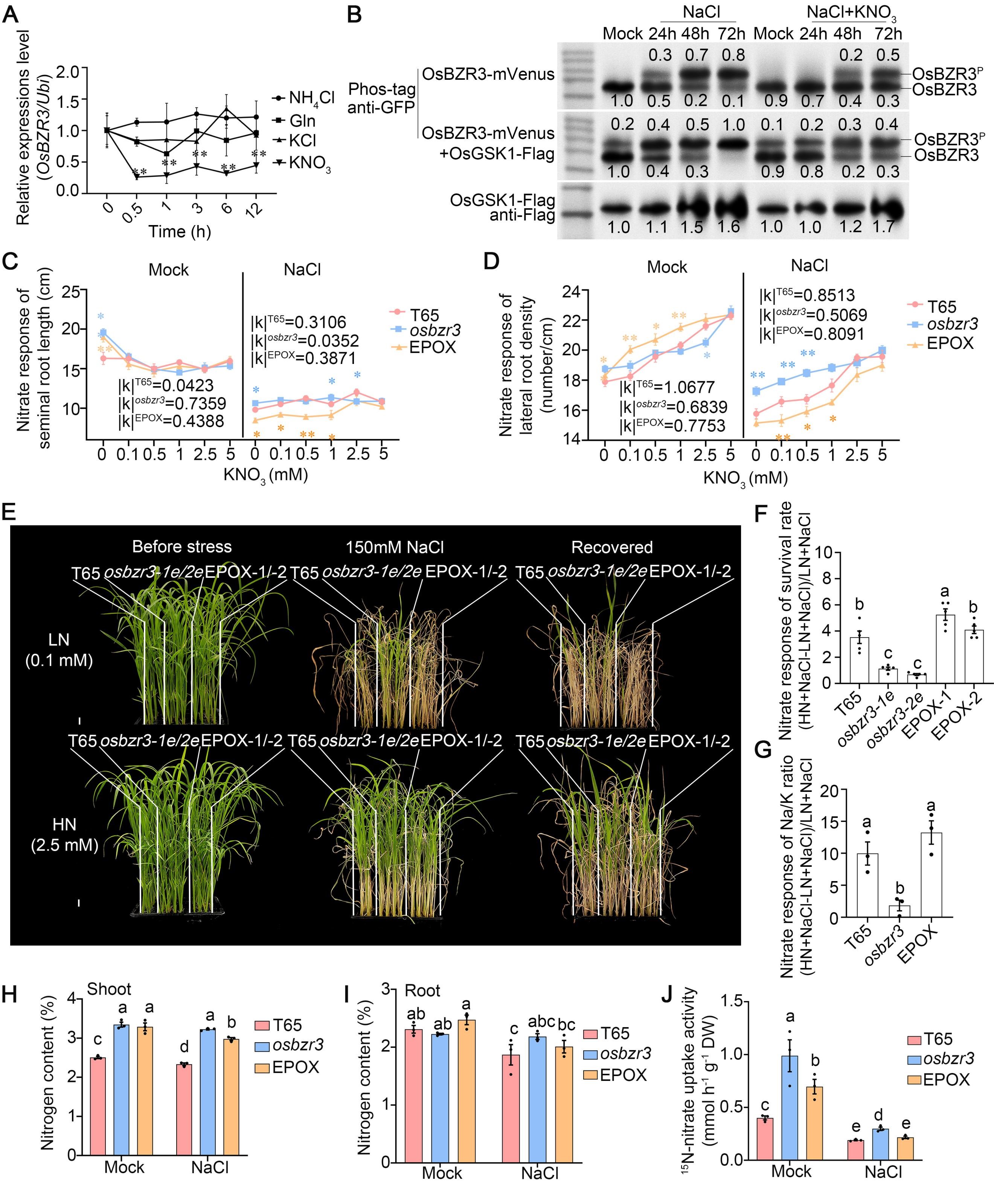 图1 OsGSK1-OsBZR3互作模块协调硝态氮信号从而介导水稻在盐胁迫下的生长恢复