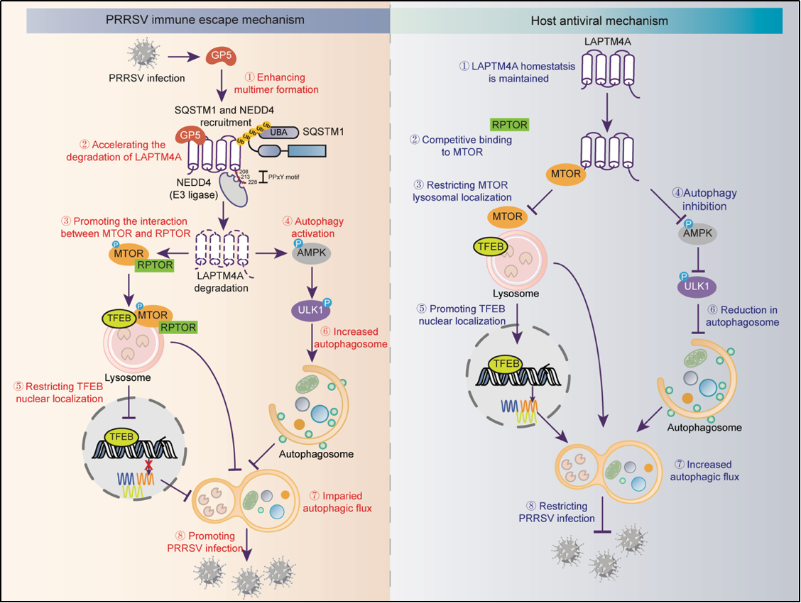 团队借助CRISPR功能筛选与酵母双杂交技术,首次发现并证实溶酶体跨膜蛋白(LAPTM4A)是抵御PRRSV感染的关键宿主因子。LAPTM4A通过调节AMPK-ULK1轴和MTOR-TFEB信号轴维持自噬通量与溶酶体稳态,从而有效抑制PRRSV感染。同时,PRRSV GP5蛋白可特异性结合LAPTM4A,并招募E3泛素连接酶NEDD4以及自噬受体SQSTM1/p62,诱导LAPTM4A发生K63型泛素化修饰,使其被选择性自噬降解。该研究揭示了LAPTM4A介导的自噬-溶酶体稳态调控在宿主抵抗PRRSV感染中的核心作用,阐明了PRRSV通过降解LAPTM4A、破坏宿主防御体系以实现免疫逃逸的分子机制。